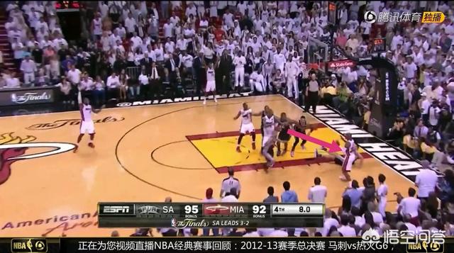 对13年总决赛g6真的印象太深刻了,波什的关键篮板,雷阿伦的逆天三分,韦德的带伤作战,詹姆斯的奋不顾身等等,可以说那支热火是被天佑的球队,大比分2-3落后,最后28.2秒热火89-94马刺,热火球权,詹姆斯在这之前接连2次失误,但是热火战术还是围绕詹姆斯进行,队友跑位,詹姆斯弧顶空位三分,投篮不中,篮板韦德一抢三,马刺三人抢到一起后球被老米勒捡到,米勒顺势给詹姆斯,詹姆斯右侧45度命中三分,分差来到2分,时间还剩20秒。