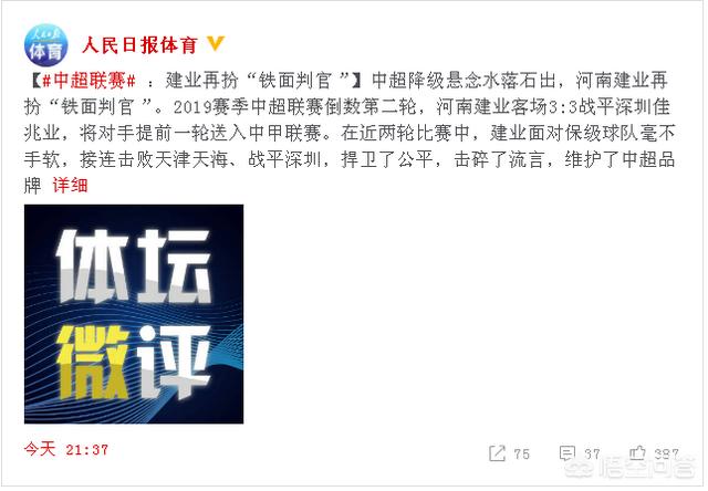 不过,人民日报倒是挺仗义的,由于建业在两球落后的情况下奋起直追,将比赛扳平;并且两度落后、两度将比分追平,最终打成3-3。人民日报的官微就发出这样一段文字——