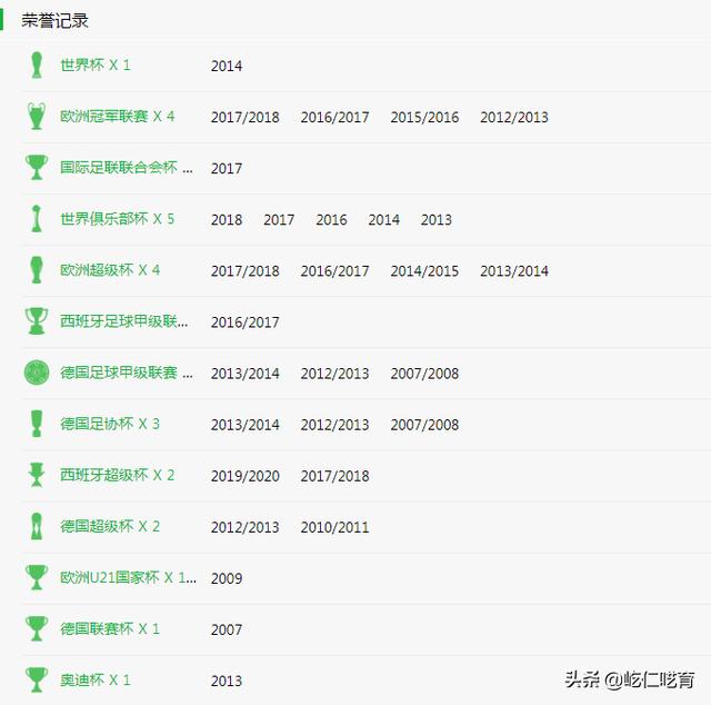 从个人能力对比,二人应是不分伯仲的;如若对比荣誉,克罗斯可能领先蒂亚戈的就不是“一星半点”了;(上图为克罗斯29个冠军头衔,下图为蒂亚戈33个冠军头衔)