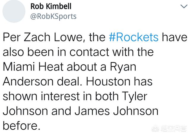 美国的确是有记者爆料火箭队和热火队商讨关于安德森的交易,火箭队对热火队的泰勒约翰逊和詹姆斯约翰逊比较感兴趣。但是火箭队关于安德森的交易一向是风声大雨点小,所以球迷们最好是先观望着事件的进度。