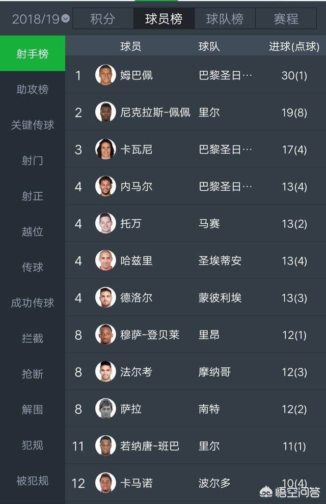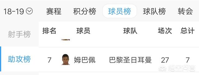 在法甲联赛的球员射手榜上,巴黎圣日耳曼的姆巴佩以30粒进球高居榜首,领先第二名11球,并且这30粒进球中只有一粒点球。队友卡瓦尼以17粒进球排在射手榜第四,内马尔以13粒进球排在射手榜第五,并且卡瓦尼和内马尔都包含4粒点球。数据统计,本赛季姆巴佩出场的次数为27场,打进30球,场均1.1个进球,并且在联赛中还有7个助攻,在法甲球员助攻榜上排名第七,在队内排第二,队内助攻次数最多的是迪玛利亚以25场10个助攻,位于法甲助攻榜第3。值得一提的是姆巴佩在欧冠中还有5个助攻,排在欧冠助攻榜首位。