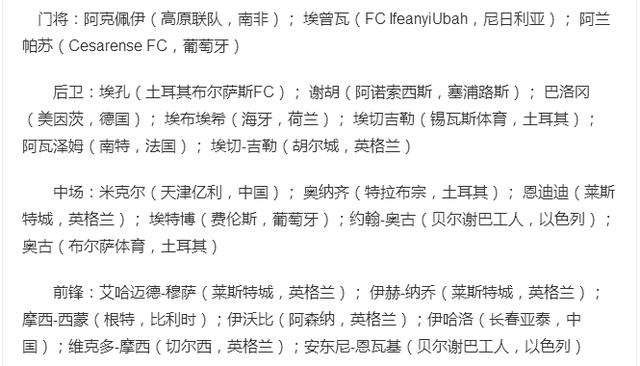 中场:米克尔(天津泰达)、奥纳齐(特拉布宗体育)、奥古(贝尔谢巴工人)、埃特博(费拉人)、恩迪迪(莱斯特城)、米克尔·阿古(波尔图)
