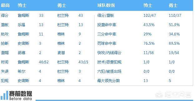 ——勇士:德雷蒙德-格林10分9助攻2篮板2断,杜兰特43分13篮板7助攻1断,麦基10分3篮板2帽,库里11分5篮板6助攻1断,克莱10分4篮板2助攻,韦斯特2篮板,伊戈达拉8分2篮板1助攻1断,贝尔10分6篮板,利文斯顿8分2助攻