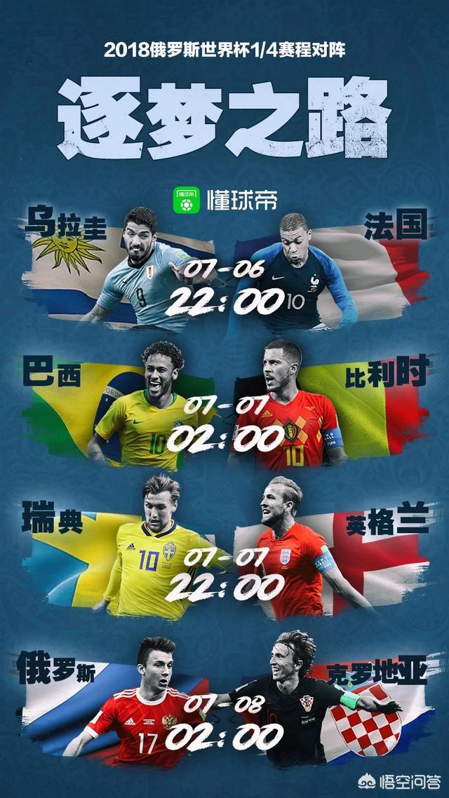 1/8决赛已经全部结束,8支晋级球队已经全部落位,世界杯也将迎来两天的休息期。7月6日晚22点,1/4决赛的战火就将点燃,法国和乌拉圭再度相遇,7日凌晨两点,五星巴西将和比利时巅峰对决!