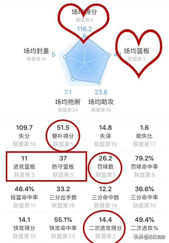 4、攻防效率:篮板、罚球、总得分、替补得分傲视全联盟。