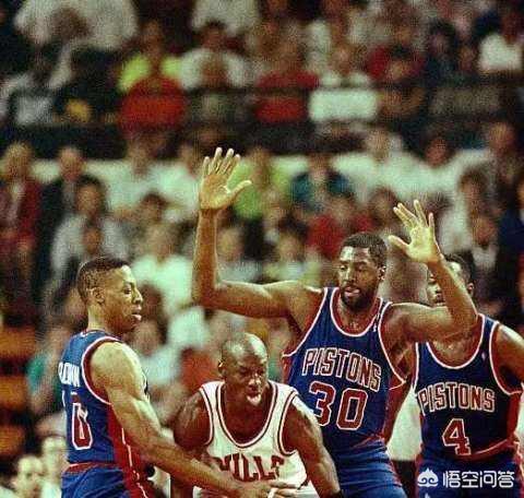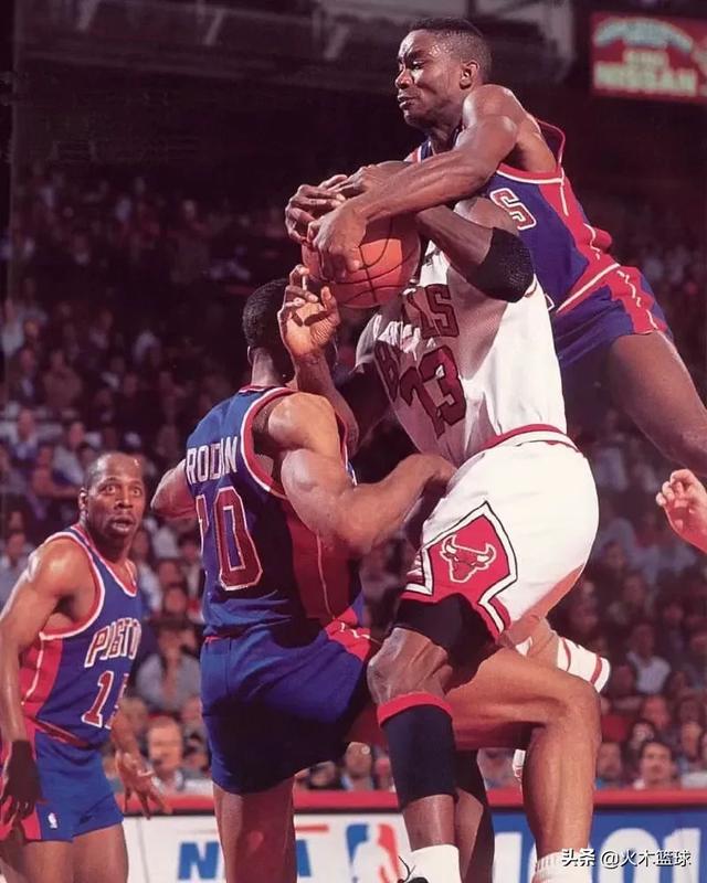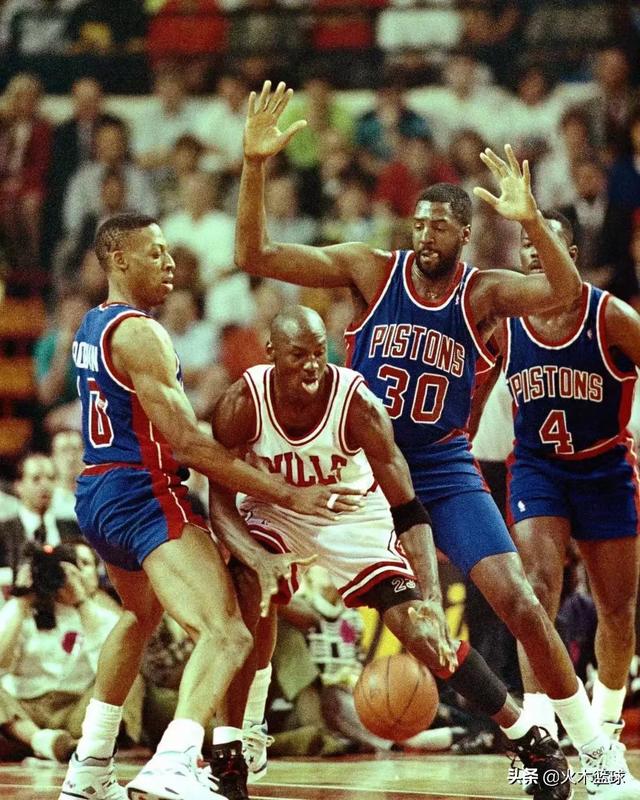 乔丹拿总冠军前一直跨不过活塞坏孩子军团,以塞亚托马斯为主的活塞每个位置都很厉害,作风强悍,乔丹那时还没有好的帮手,一直越不过活塞,有点像08年组建的凯尔特人,联盟的标杆,谁要进总决赛必须要战胜绿军。那时鼓励对抗,推两下就算事儿,给你一铁肘也没啥。