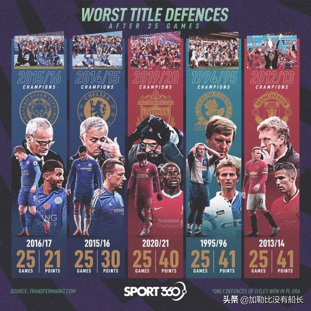 不过相较于上述四大联赛的激烈程度,在英超面前那也不过只是小巫见大巫罢了。据统计英超时代25轮联赛过后积分最少的5个卫冕冠军情况具体如下,从这5个卫冕冠军在紧接着那个赛季惨状,对于英超冠军争夺的惨烈也可略知一二了: