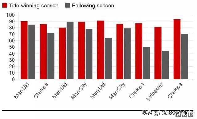 让我们来看一组数据,上图中的红色柱体是球队拿到冠军赛季的联赛积分,灰色则是接下来那个赛季的积分。著有《西班牙文化中的巴塞罗那模式》一书的休斯同样认为一支成功的队伍里应该有4-5名球员为所有人做出防止骄傲自满的表率。“看看曼联、切尔西和再往后的利物浦,”他说道。“他们有不少球员能够划出一条精神属性的线,每到赛季结束又归零重来。曼联的吉格斯、斯科尔斯和加里-内维尔都曾经历过连续夺冠的赛季,但他们无一不是更衣室的典范,永远都不会骄傲自满。”