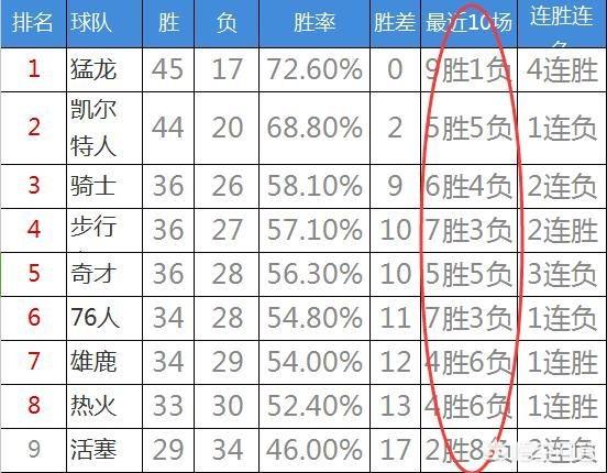 猛龙队和凯尔特人领先第三名的骑士队7个胜场,这两对可以说稳定的占据了东部前两名,步行者和76人全明星赛后发力,是继猛龙之后最好的球队了,近10场比赛两支队伍都是7胜3负;