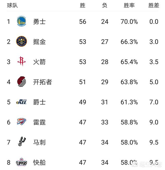 按照以上的推测,雷霆和马刺的战绩会是相同的,但在本赛季双方的交战中,马刺占优,那么马刺将会排在第六,雷霆第七,快船则垫底,排在第八。