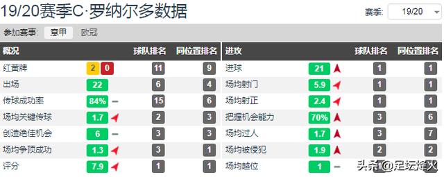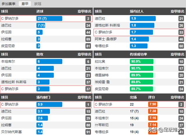 我们再来看看当妈又当爹的C罗,35岁了,位置更多出现在中锋的他,场均还要贡献1.7次过人和位列球队并列第四的3次助攻,而队内第一助攻手本坦库尔6次助攻连丁丁的领头都不够。这也是尤文现在最大的短板,没有人能有效地为C罗有效地输送炮弹,经常单打独斗搞得数据看起来特别像浪射王。