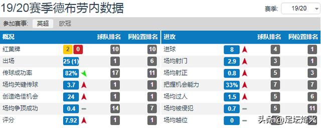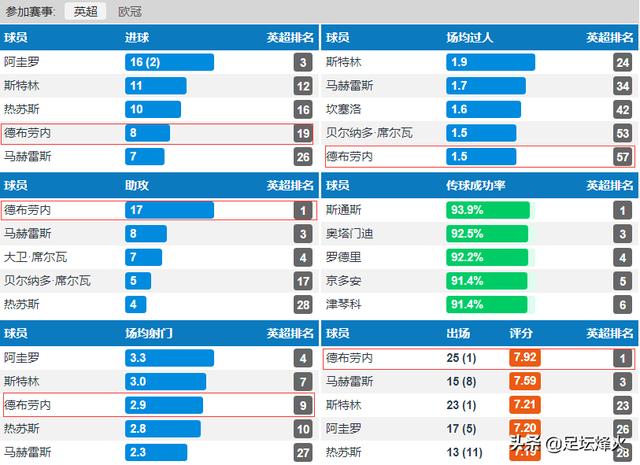 德布劳内在曼城现在真是有点又当爹又当妈的意思,17次助攻的同时还贡献位列球队第三的场均2.9次射门,位列队内第四的8个进球,以及位列球队第五的场均1.5次过人,仅落后第一的斯特林0.4次。所以丁丁的这番言论,颇有诟病自家前锋把握机会能力差的意思,不过也不怪丁丁,队内前三射手阿圭罗、斯特林、热苏斯都比35岁老将C罗的进球能力差点意思。