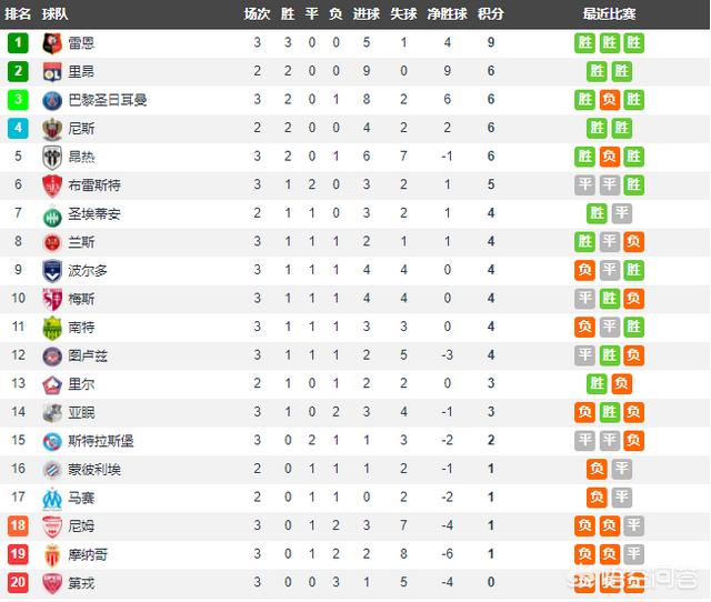 1-5名:雷恩(不变)、里昂(不变)、巴黎圣日耳曼(巴黎圣日门)、尼斯(不变)、昂热(不变);