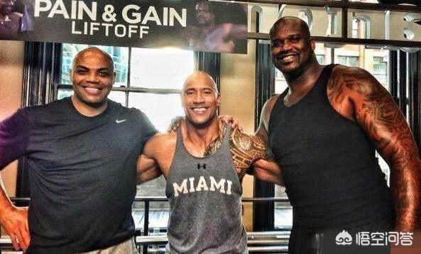 巨石强森大家都很熟悉,如果将他单拿出来,要比普通人强壮很多,至少从视觉角度来看。那么强森和奥尼尔合影时,就发现巨大的差距了。不仅仅是身高的差距,身体的健壮程度也没有办法比。再看看旁边的巴克利,巴克利也要比强森身体宽,但是和奥尼尔相比,也不如他。
