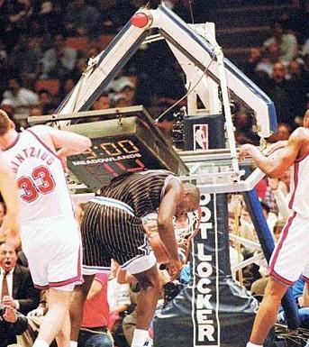 1993年2月,菜鸟赛季的奥尼尔随魔术客场对阵太阳,比赛开始不久,奥尼尔接队友传球,撞开对手后顺势大力扣篮,全场观众欢呼到一半突然一同惊呼,接着都目瞪口呆。只见整个篮球架被他拉到在地,而奥尼尔也被计时器砸中了脑袋。
