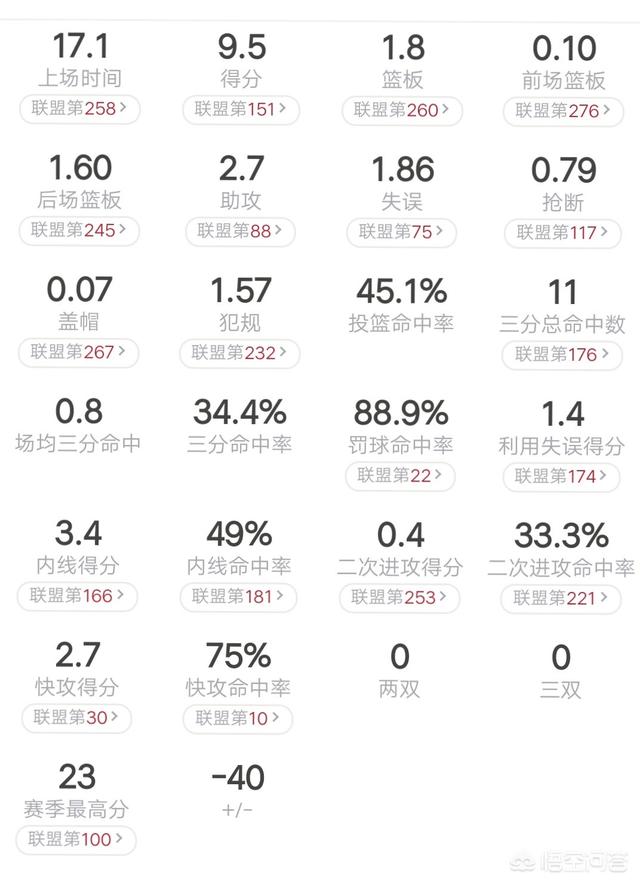 作为对比,以下是他的各项数据在全联盟的排名。